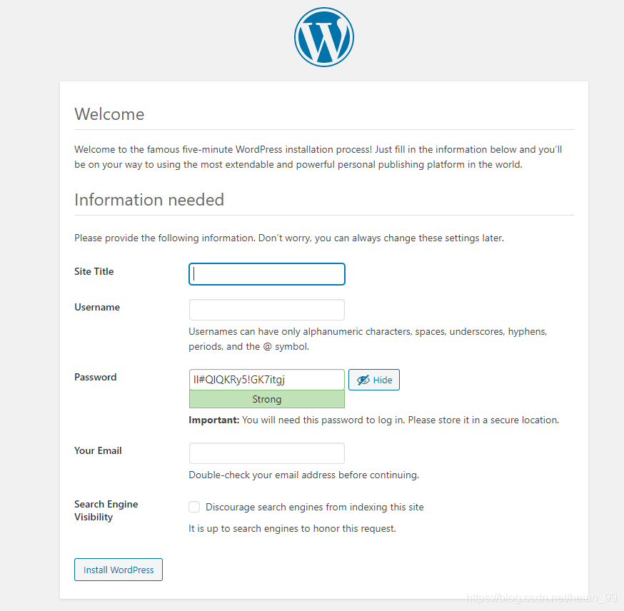 可以看到 wordpress 服务产生了一个 30455的端口,现在我们就可以通过 http://<任意节点的NodeIP>:30012 访问我们的应用了,在浏览器中打开,如果看到 wordpress 跳转到了安装页面,证明我们的安装是正确的,如果没有出现预期的效果,那么就需要去查看下 Pod 的日志来排查问题了,根据页面提示,填上对应的信息,点击“安装”即可,最终安装成功后